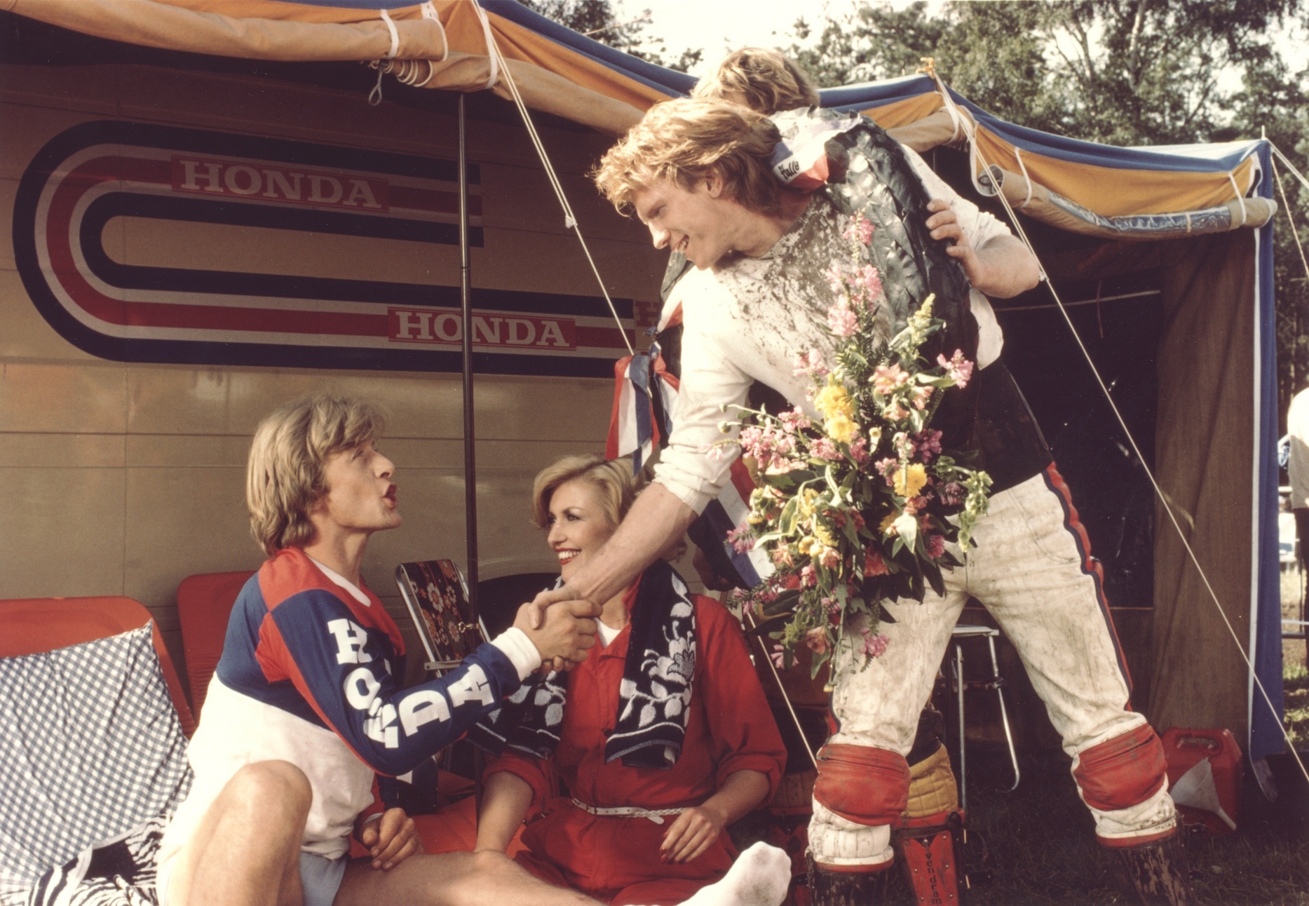 Three best friends in their twenties, one redhead, one dark and one blond. Rien, Eef and Hans (Hans van Tongeren, Toon Agterberg, Marten Spanjer) work together at a mechanic shop: Rien drives a dirt bike and Eef can take one apart and put it back together… blindfolded! They love to race and ride at local events and they all idolize the the champ — their hero Gerrit (Rutger Hauer).