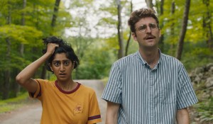 Su and Jack (Sunita Mani, John Reynolds) are a Brooklyn couple in their early 30s. They love each other but something seems to be missing. It could be because they spend their lives glued to smart phones for texting, social networks and search engines. They can’t answer a simple question without googling it first. So when a friend at a wedding party offers them the use of his grandparents’ cottage in the woods, they decide it’s now or never. They cut the cords and take a week off-grid. That means no schedule, no email, no listicles, and no phone. Their lives will be authentic and spontaneous. So they pack their bags – along with ample arugula and kale – and drive up north, At the cottage they notice new things. Meteors falling from the sky. And have frank conversations. Jack tries to become more manly by chopping wood while Su resists pulling out her phone. It’s difficult but they can manage. Until things start to get strange. Loud bangs n the background. And an auburn pouffe — sort of a fluffy Ottoman – they find in the cottage. Why does it keep moving… by itself. Are they crazy? Or is