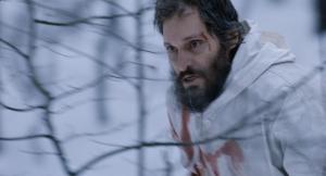 So now he’s taken away to some unidentified place (a black site) where he’s placed on his back, screamed at in English (he can’t hear after the explosions) and then waterboarded. Next, he’s off with other prisoners on some snowy forest road – looks like Canada – and there’s an accident. He gets out of the truck, grabs a gun and starts a long, painful, and violent trek trough the woods of rural Poland, pursued by US Special Ops and helicopters.