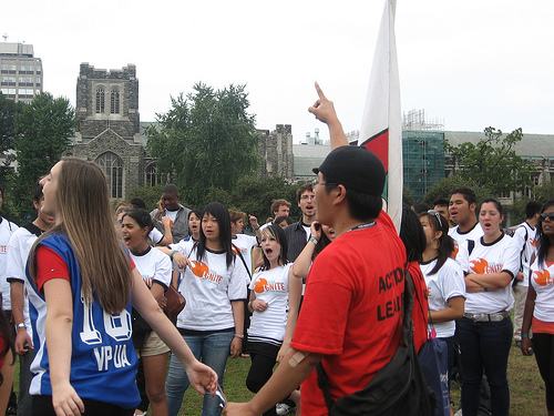Oh, wait… never mind. They’re not political at all. They’re freshers, newly-arrived students at the downtown universities, getting used to the big city, and bonding with their dorm-mates so they can feel patriotic toward one building over another.